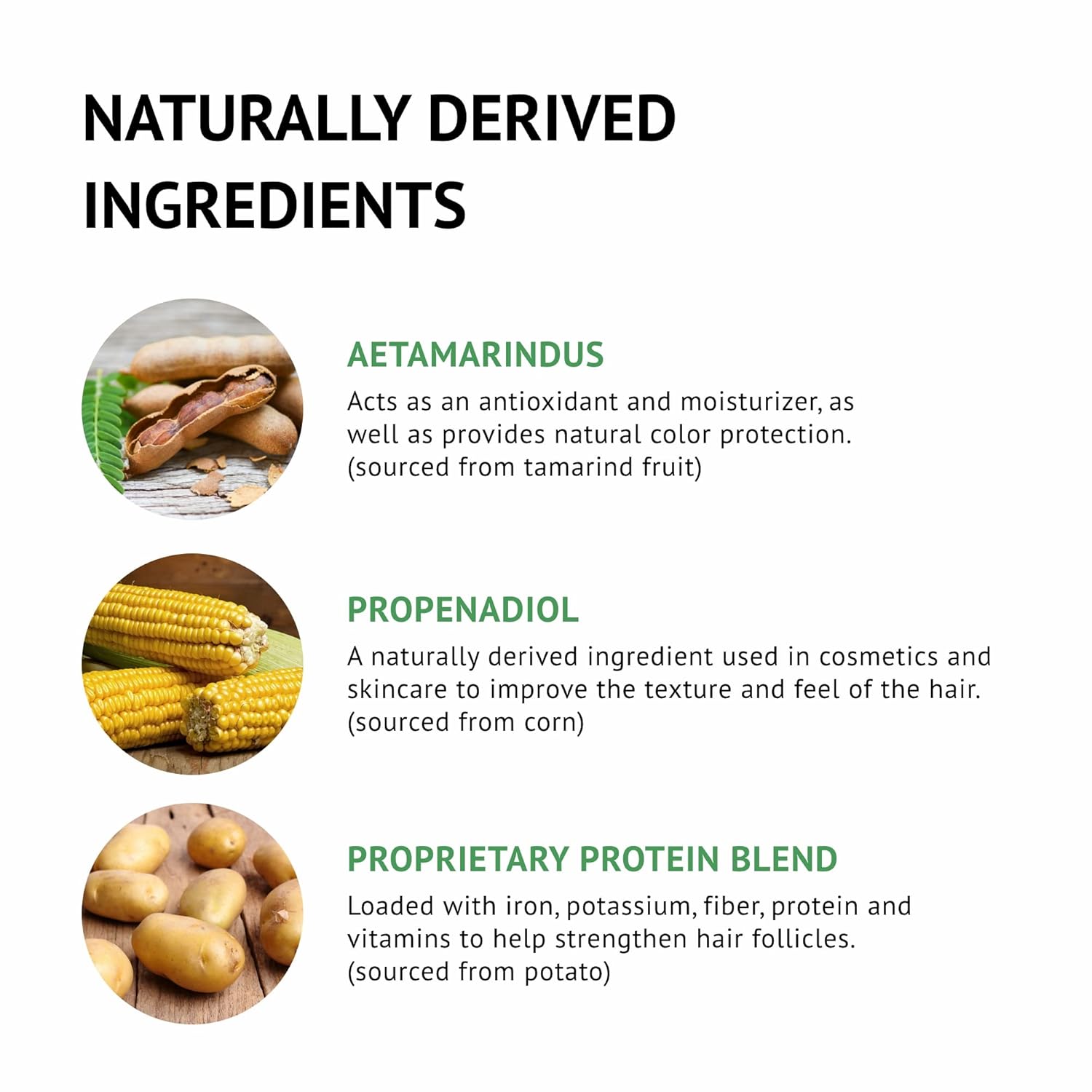 - Natural ingredients: Atamarindus (tamarind fruit extract) for antioxidants and moisturizing benefits, propanediol (corn) to increase hair texture, and a proprietary protein mixture to strengthen hair follicles.